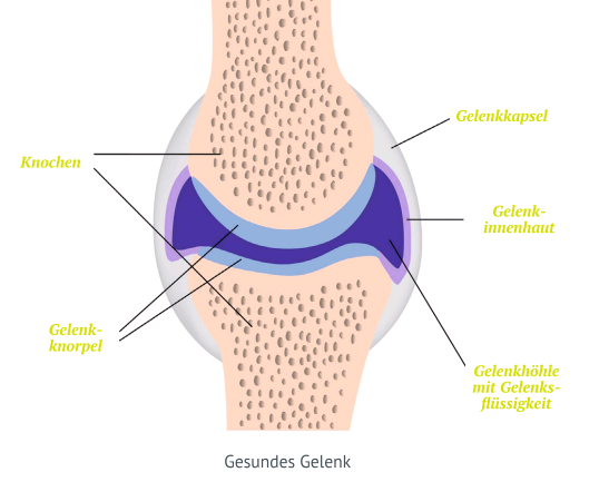 Die Gelenke verbinden die Knochen miteinander und ermöglichen somit eine Beweglichkeit. Der Gelenkknorpel wirkt dabei wie eine Art Stoßdämpfer für die Gelenkknochen. Im Knorpel finden ständig sowohl aufbauende wie auch abbauende Prozesse statt. Für die aufbauende Funktion benötigt der Knorpel eine konstante Zufuhr an allen dafür notwendigen Nährstoffen aber auch Bewegung. Nur durch Bewegung können Nährstoffe über die Gelenksflüssigkeit in den Knorpel gelangen, da im Knorpel keine Blutgefäße vorhanden sind. Der Knorpel besteht hauptsächlich aus Proteoglykanen wie z.B. Glycosaminoglykane (GAG). Dazu gehören Stoffe, die die Knorpelbildung unterstützen wie z.B. Glycosamin und Hyaluronsäure.