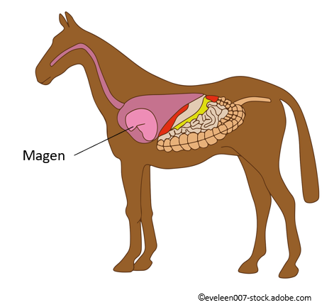Der Magen ist in zwei Bereiche aufgeteilt. Der vordere Bereich ist drüsenlos, im hinteren Bereich befinden sich in die Schleimhaut eingelagerte Drüsen. Diese Drüsen produzieren den Magensaft. Der Magensaft besteht aus Salzsäure und dem eiweißspaltenden Enzym Pepsin. Zum Schutz vor Selbstverdauung ist der Magen im hinteren Bereich durch eine dicke Schleimhautschicht geschützt. Probleme können entstehen, wenn z.B. das Futter nicht ausreichend zerkaut und eingespeichelt wird. Der Speichel enthält nämlich Bikarbonat, welches eine gute Pufferung der Magensäure sicherstellt. Bei nicht ausreichend zerkautem und eingespeicheltem Futter kann die Magensäure dann den Nahrungsbrei nicht komplett durchdringen und es kommt zum Entstehen von überschüssiger Magensäure. Diese kann dann wiederum zu Magenproblemen beim Pferd bis hin zur Entstehung von Magengeschwüren führen.