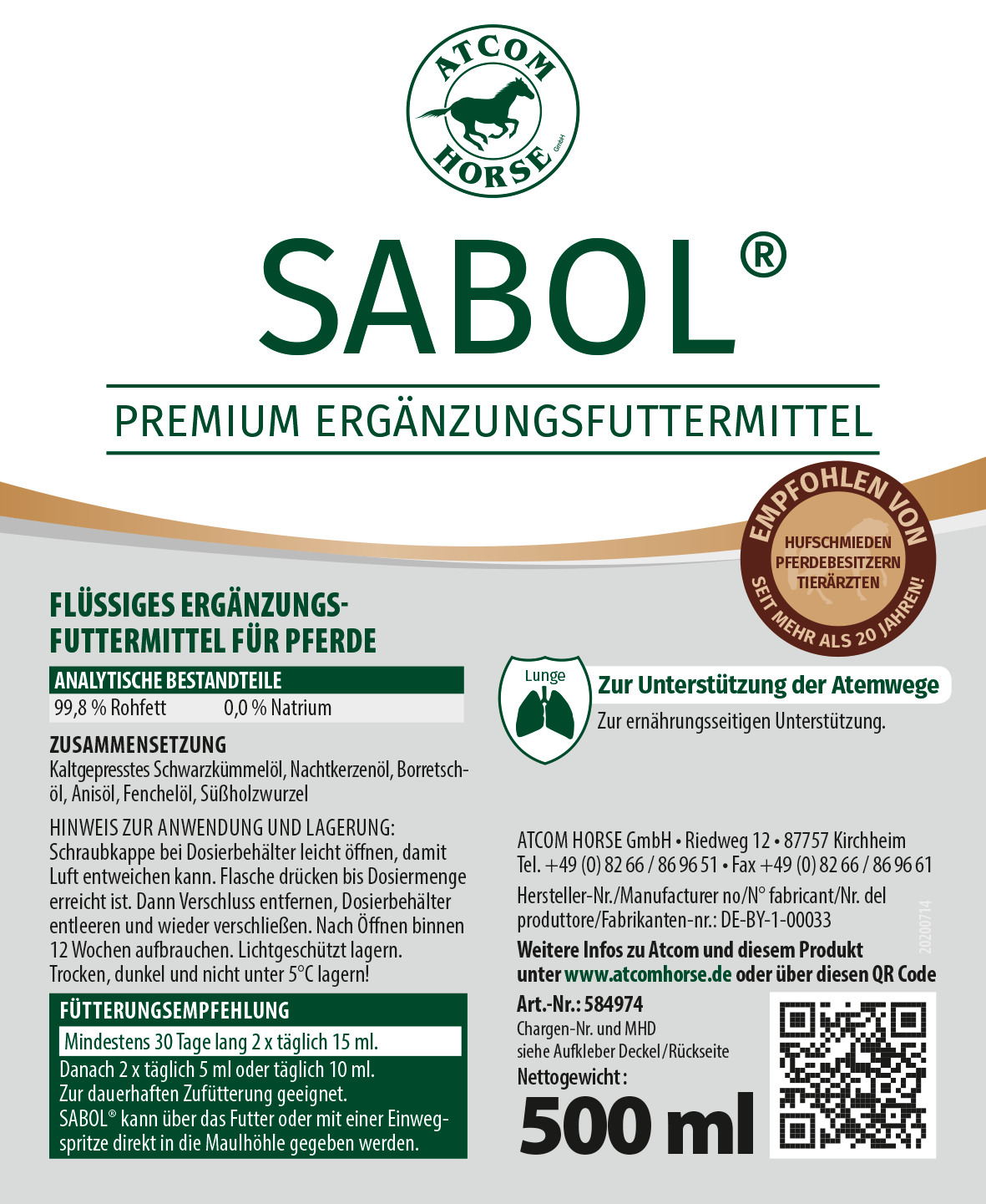 Sabol® zeichnet sich durch eine spezielle Kombination aus kaltgepresstem ägyptischem Schwarzkümmelöl, Nachtkerzenöl und Borretschöl aus. Schwarzkümmelöl, Nachtkerzenöl und Borretschöl liefern einen hohen Anteil an den mehrfach ungesättigten Fettsäuren Linolsäure und Linolensäure, auch bekannt als Omega-3- und Omega-6-Fettsäuren. Die Öle liefern nutritiv wichtiger Inhaltsstoffe, welche die natürliche Reinigungsfunktion der Atemwege aufrecht erhalten können.
