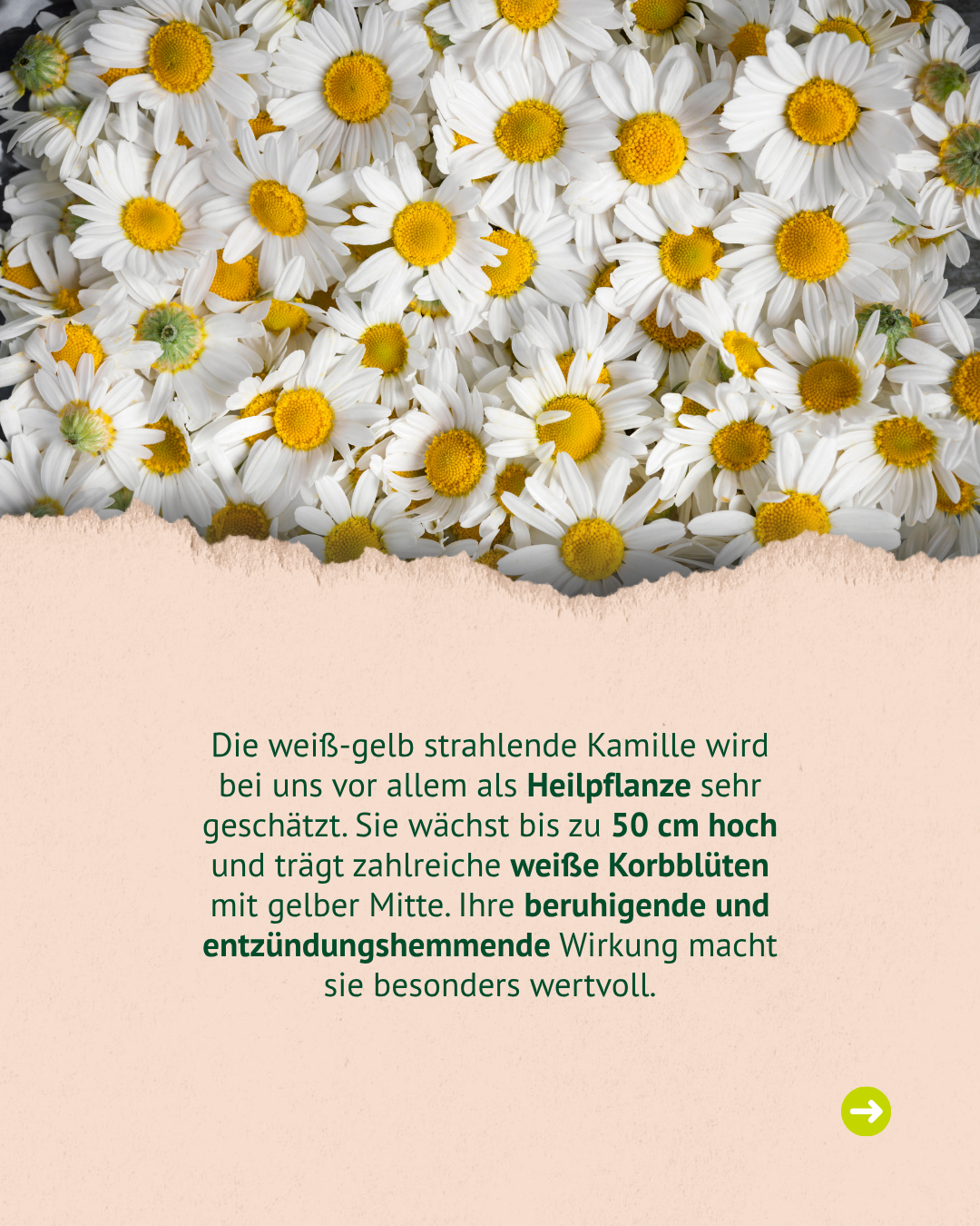 Dank ihrer Eigenschaften wird die Kamille traditionell auch gerne zur äußeren Pflege verwendet. Ein Sud aus Kamillenblüten kann zur Reinigung und Beruhigung bei der Pflege von Hautirritationen und Wunden eingesetzt werden.