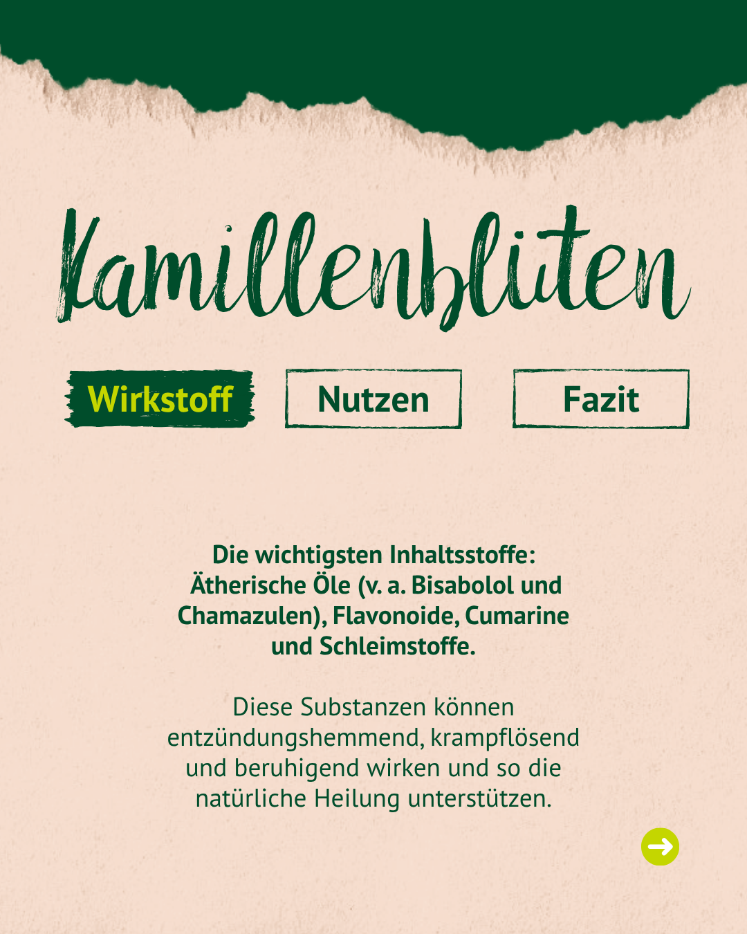 Die wichtigsten Inhaltsstoffe, darunter Ätherische Öle (v. a. Bisabolol und Chamazulen), Flavonoide und Schleimstoffe, können zur allgemeinen Unterstützung des Organismus beitragen: