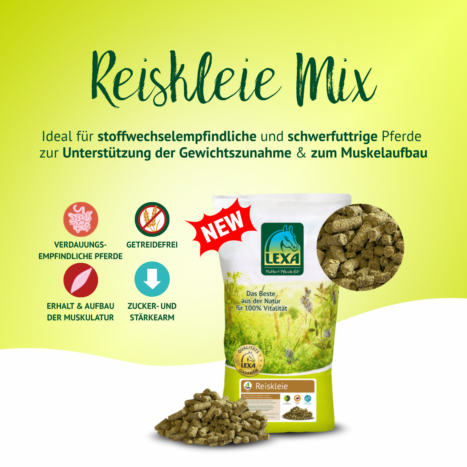 Der LEXA Reiskleie Mix wurde speziell entwickelt, um Pferde auf schonende Weise beim Auffüttern zu unterstützen. Das Produkt kombiniert hochwertige Reiskleie mit ausgewählten Faserkomponenten und bietet dadurch eine ideale Energiequelle – ganz ohne Getreide, Soja oder Melasse. Dank der schonenden Pelletierung ist der Reiskleie Mix besonders staubarm und leicht zu füttern.